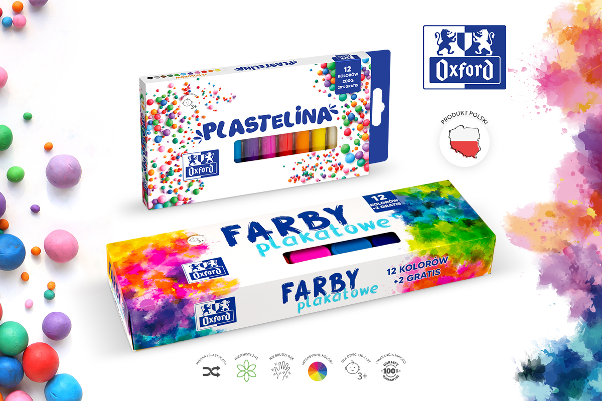 Farby plakatowe Oxford doskonale sprawdzą się w każdej szkole, przedszkolu czy pracowni artystycznej. Poza intensywnymi kolorami i gęstą konsystencją Oxford stawia na wysoką jakość opakowań. W kubeczkach zastosowano pełny gwint, dzięki czemu wieczko zakręca się szczelnie, bez przekręcenia. Farby nie wysychają i można ich używać jeszcze dłużej bez utraty jakości. We wnętrzu opakowania umieszczono wskazówki mieszania kolorów - teraz każdy może się poczuć jak profesjonalista. Ilość kolorów w opakowaniu nie stanowi już żadnego ograniczenia, w każdej chwili można stworzyć dowolną ilość nowych barw.