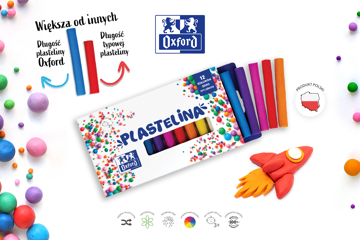 Kolorowa plastelina Oxford jest idealna do nauki i zabawy dla dzieci w każdym wieku. Miękka i elastyczna, łatwo poddaje się modelowaniu, a dziecięce rączki nie męczą się podczas nadawaniu kształtów swoim rzeźbom. Intensywne kolory rozbudzają wyobraźnię i inspirują do tworzenia niezwykłych prac. Plastelina pozostaje miękka, a zbudowane figurki można rozebrać i ponownie wykrozystać do nowych pomysłów. Odkryj produkt najwyższej jakości - bezpieczny i nietoksyczny. Zrównoważony dobór barwników sprawia, że plastelina nie brudzi rąk, a kolory pozostają intensywne.
