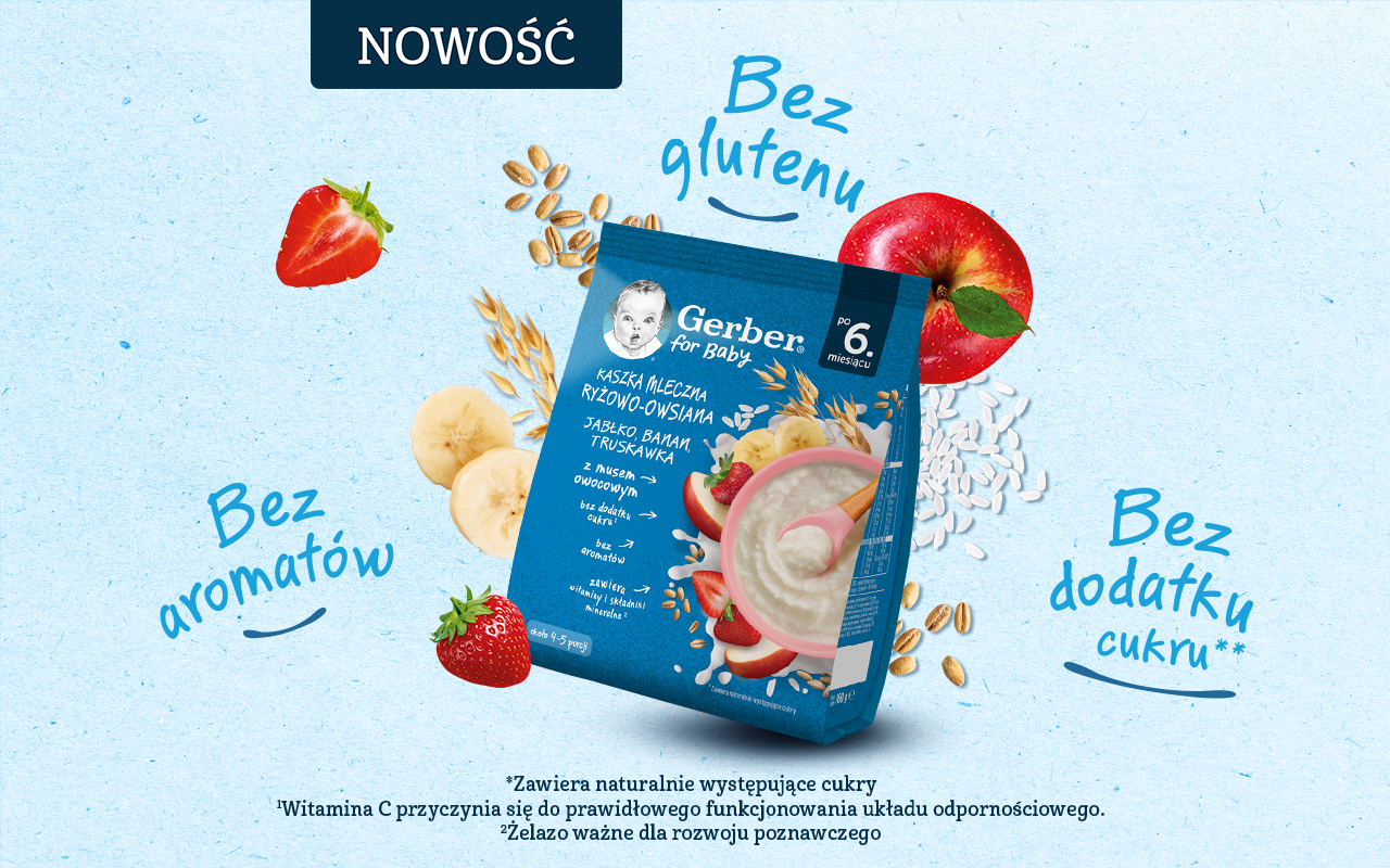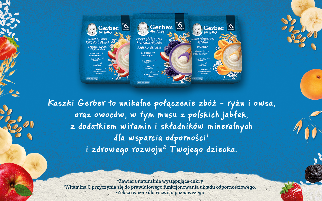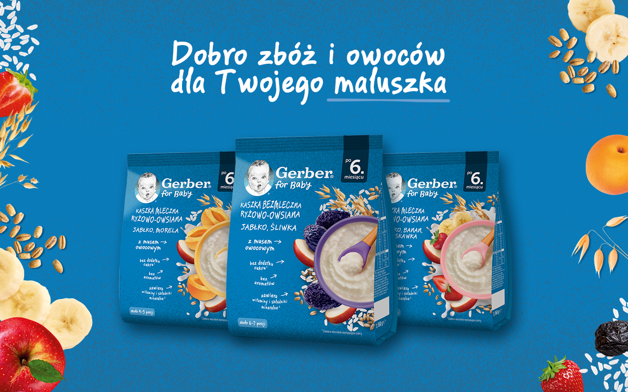 Produkty zbożowe to kluczowy element diety dziecka. Wprowadza się je do jadłospisu maluszka m.in. po to, by pomóc zaspokoić jego rosnące zapotrzebowanie energetyczne i uczyć dziecko nowych smaków. Zboża można podawać pod postacią różnych produktów, jednak niemowlę jako pierwsze zwykle poznaje właśnie kaszki. Wynika to głównie z ich konsystencji, dobrze dopasowanej do potrzeb i możliwości dziecka na etapie rozszerzania diety. To właśnie dla takich, wymagających maluszków, które ukończyły 6 miesięcy, powstały nowe produkty marki Gerber - kaszki ryżowe oraz kaszki ryżowo-owsiane, które są idealnym pomysłem na wprowadzenie do diety dziecka zbóż.