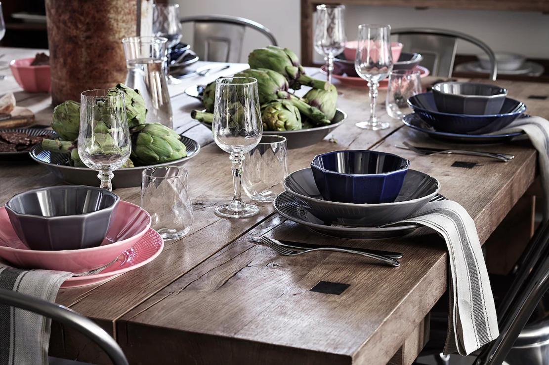 Zestaw produktów zawiera głównych bohaterów, którymi jest garnek OUMBÄRLIG i naczynie żaroodporne MIXTUR oraz naczynia DINERA (4 duże talerze i 4 miski) i 4 kieliszki HEDERLIG.