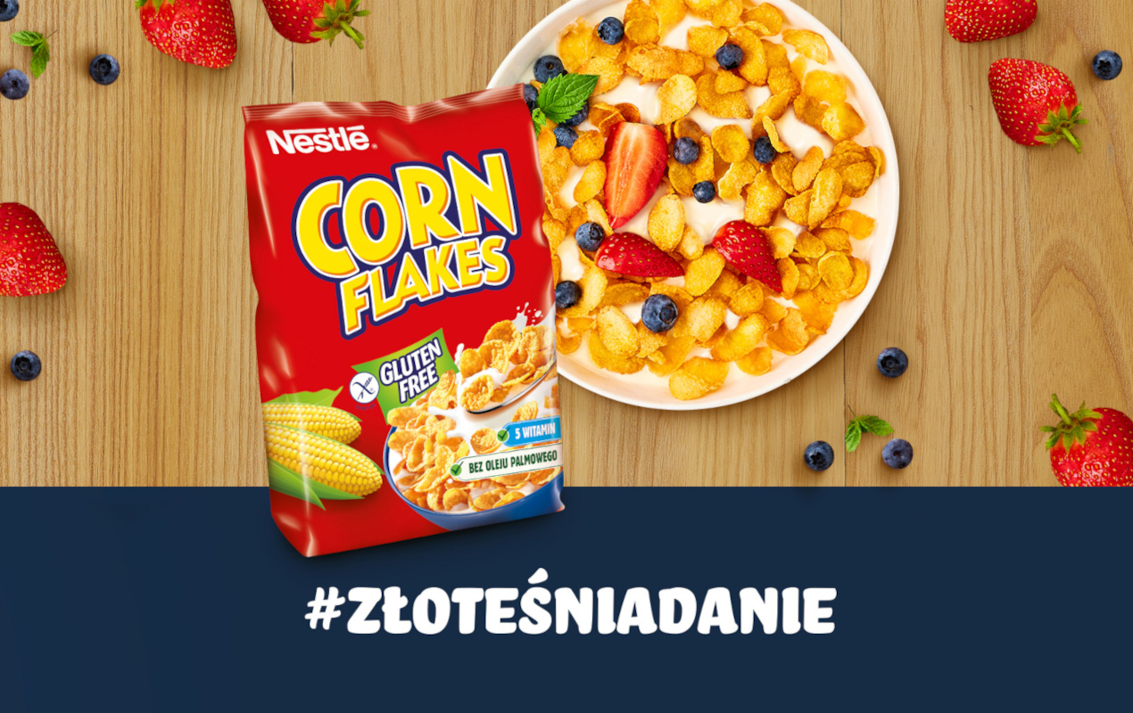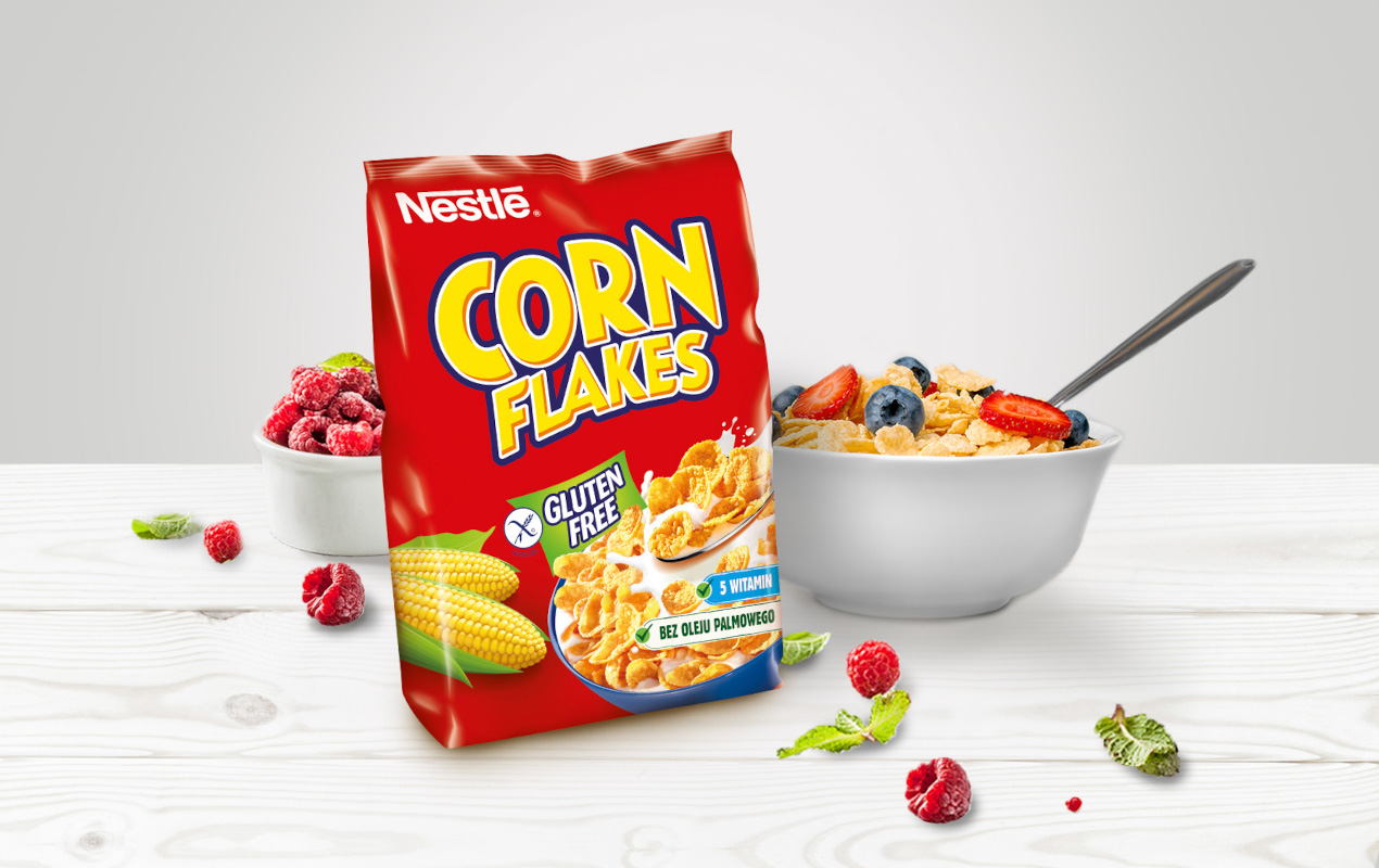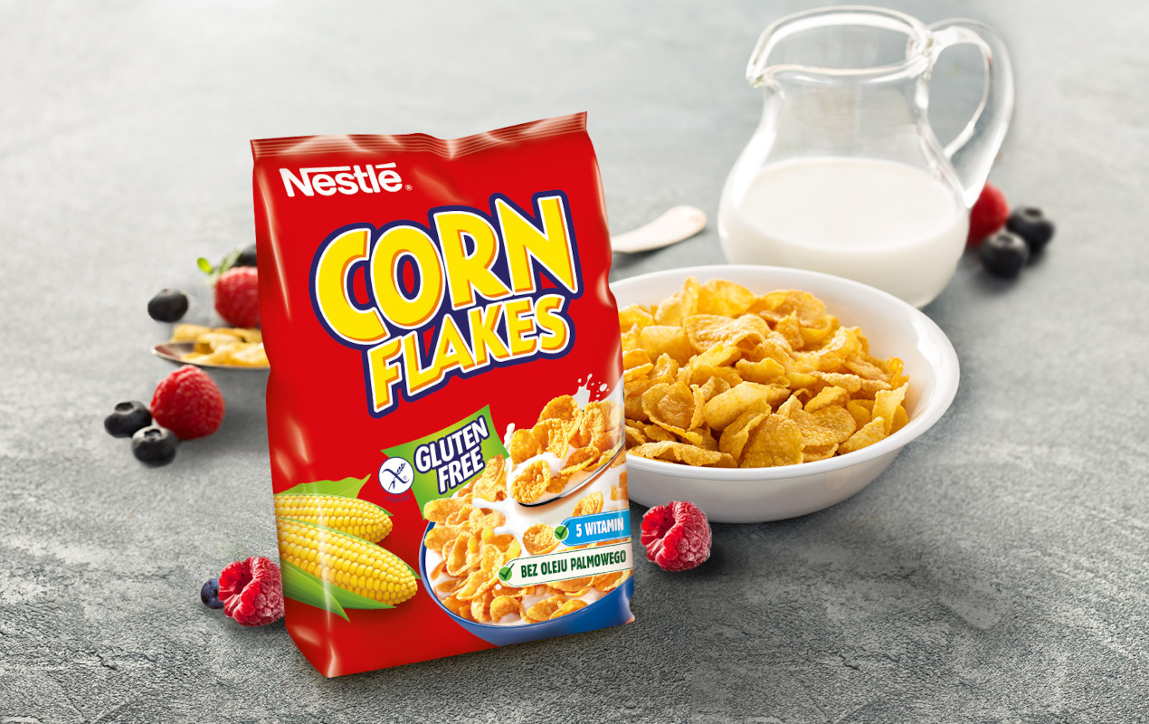 Płatki Nestlé CORN FLAKES to idealny sposób na pyszne i zdrowe śniadanie dla całej Twojej rodziny. Delikatnie opiekane, chrupiące płatki będące źródłem 5 witamin, w tym kwasu foliowego. Ich największą zaletą jest to, że są bezglutenowe i nadają się idealnie dla osób chorujących na celiakię bądź stosujących dietę bezglutenową. Płatki Nestlé CORN FLAKES możesz jeść na różne sposoby i stworzyć własne, złote śniadanie dodając do nich swoje ulubione dodatki takie jak owoce, orzechy, miód czy jogurt. Spróbuj teraz!