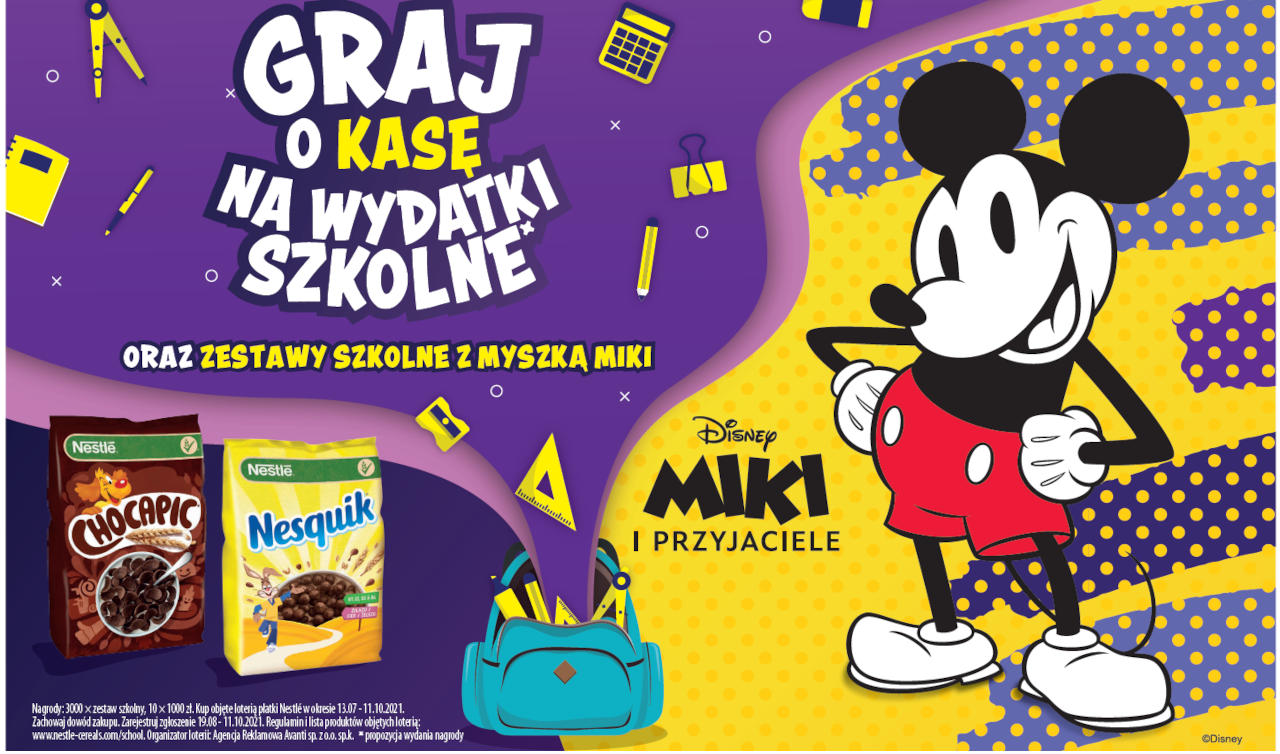 Powrót do szkoły to moment pełen wyzwań zarówno dla dzieci, jak i dla ich rodziców. Uczniowie wracają do ławek szkoły po długiej wakacyjnej przerwie i na nowo muszą wpaść w szkolny rytm. Dla rodziców jest to przede wszystkim czas przygotowań i zakupów związanych ze szkołą. Producent płatków śniadaniowych Nestlé przychodzi z pomocą i umila ten czas dzieciom, a także wspiera rodziców. Już w sierpniu rozpoczną się zgłoszenia do loterii Powrót do szkoły z Myszką Miki i płatkami śniadaniowymi Nestlé, w której do wygrania są wyjątkowe zestawy szkolne! Dodatkowo można wziąć udział w losowaniu nagród głównych, czyli 10x1000 zł na wydatki szkolne*. Więcej szczegółów znajdziesz na http://www.nestle-cereals.com/pl/school