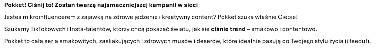 POKKET to marka, która udowadnia, że szybka przekąska może być jednocześnie smaczna, nowoczesna i pełna charakteru. Pokket został stworzony z myślą o młodych, aktywnych osobach, które cenią wygodę, różnorodność i dobry smak. W tej kampanii liczy się autentyczność – Twoja opinia, Twój content i Twój styl!