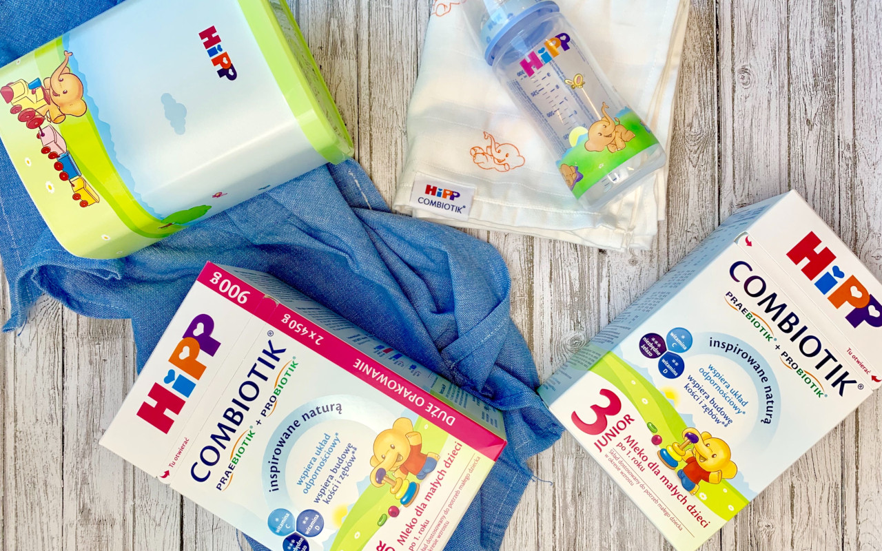 Oferujemy Wam zestaw produktów HiPP 3 COMBIOTIK® wraz z pudełkiem na mleko, butelką na mleko i pieluszką tetrową z bawełny BIO.