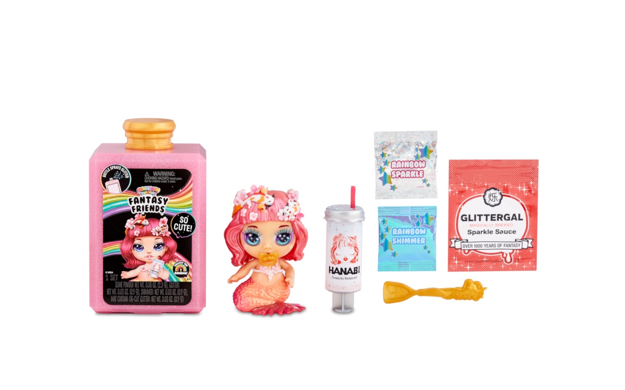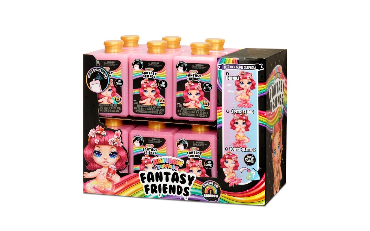 Fantasy Friends - pudełeczko w kształcie flakonika perfum, a w nim ukryte fantastyczne niespodzianki, które czekają aż je ktoś rozpakuje. W środku znajduje się jedna z 16 laleczek, które pochodzą z magicznej krainy. Większość z nich to wróżki lub syrenki. Mini laleczki są słodziutkie i każda z nich ma w buzi smoczek. Posiadają różne ozdoby - od motylków aż po kwiatki. Kolekcja nazywa się Rainbow, ponieważ, gdy zbierzesz wszystkie figurki, będziesz mogła ustawić je kolorystycznie zgodnie z kolorami tęczy. Buteleczka pryska brokatem! Po napojeniu laleczki otrzymujemy slaim do zabawy, a buteleczka pryska brokatem!