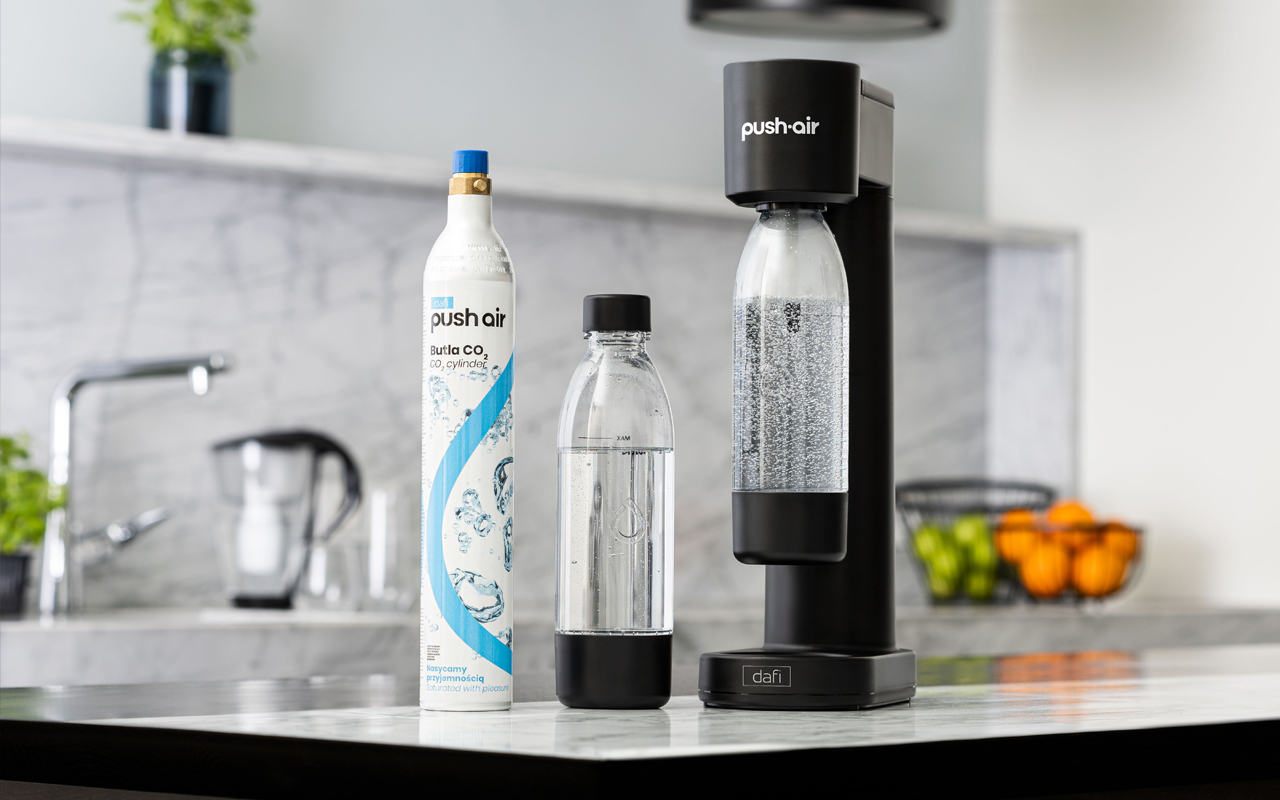 Saturator Dafi PUSHAIR to urządzenie do domowego przygotowywania wody gazowanej według własnych preferencji smakowych. To nowoczesny sprzęt, który sprawi, że zwykła woda kranowa, stanie się niezwykle orzeźwiającą wodą musującą. Dzięki saturatorowi PUSHAIR możemy uniknąć konieczności kupowania wody gazowanej w butelkach, co jest zarówno wygodne, jak i ekologiczne. Korzystanie z saturatora PUSHAIR Dafi jest oszczędne, ponieważ umożliwia wielokrotne przygotowywanie różnych napojów gazowanych przy użyciu tego samego urządzenia, co zmniejsza ilość generowanych odpadów PET.