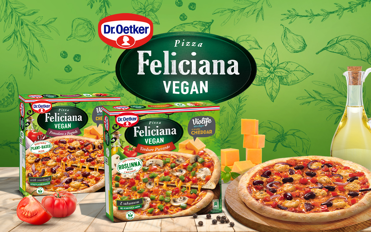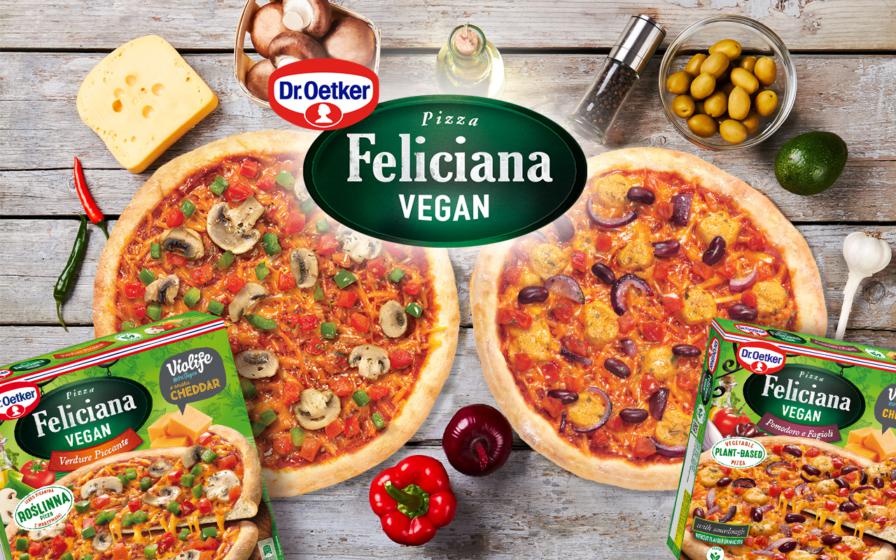 Feliciana Vegan Pomodoro e Fagioli to roślinna pizza z warzywami i dodatkiem kremowego sosu. Pyszną kompozycję smakową tworzą Violife o smaku cheddar, czerwona fasola, która jest docenianym źródłem roślinnego białka, soczyste pomidory i wyrazista w smaku czerwona cebula. Wszystko to znakomicie uzupełniają aromatyczny sos pomidorowy oraz dodatek kremowego sosu na wierzchu pizzy. Pizza Feliciana Vegan to idealny wybór dla wegan, wegetarian, osób nietolerujących laktozy i ograniczających spożycia mięsa.