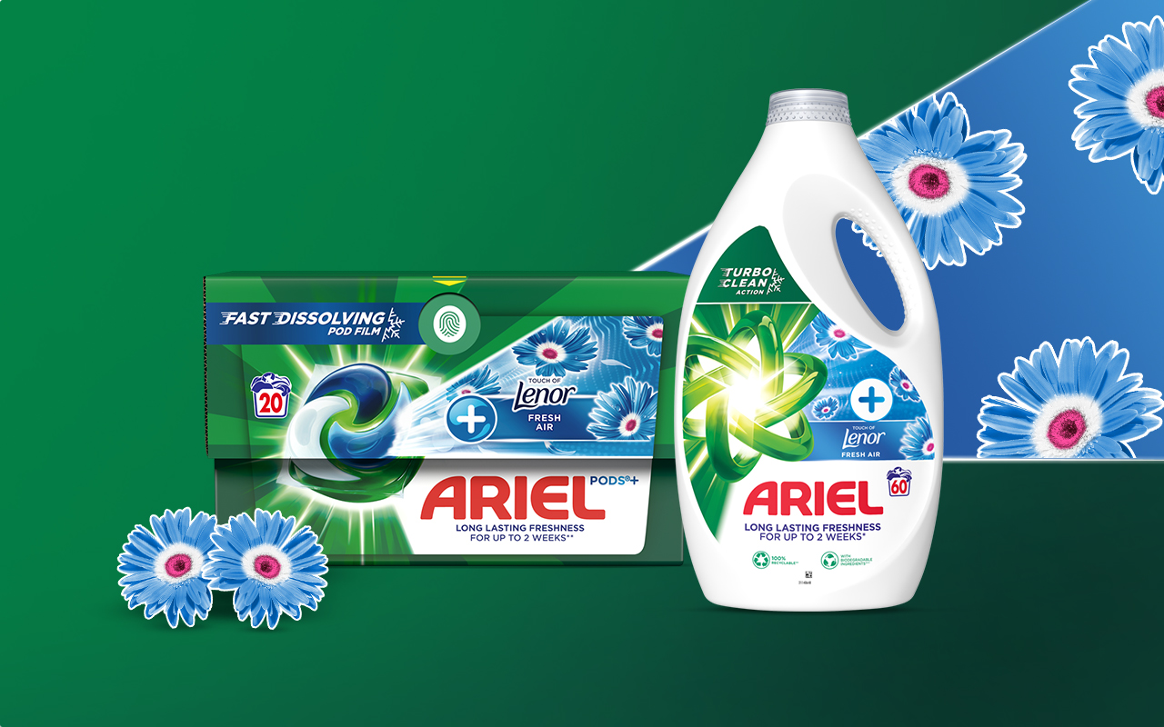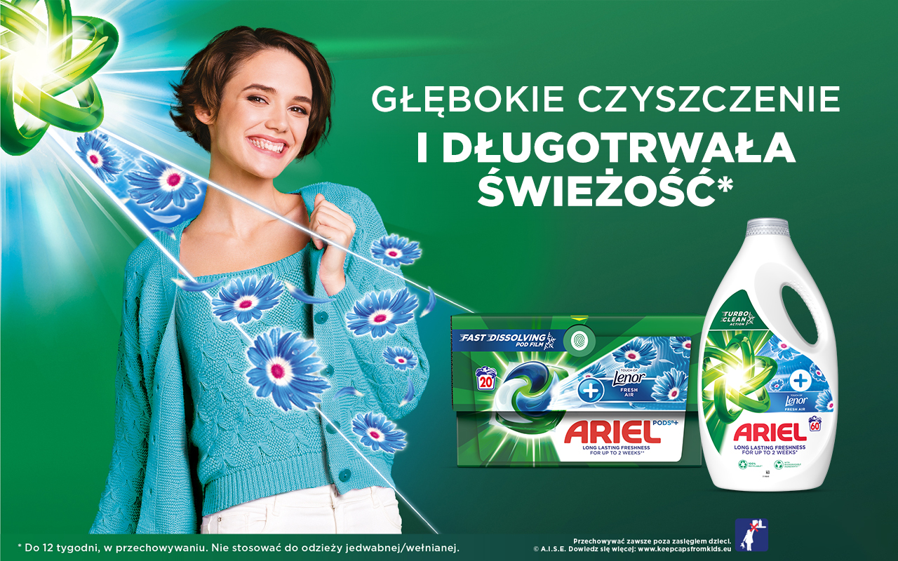 Najnowsze produkty marki Ariel: kapsułki Ariel PODS + Touch Of Lenor Fresh Air oraz płyn do prania Ariel + Touch Of Lenor Fresh Air nadają ubraniom orzeźwiającą świeżość. To połączenie jest wyjątkowo korzystne. Zarówno kapsułki, jak i płyn łączą w sobie niezawodną moc czyszczącą, z której słynie Ariel oraz długotrwałą świeżość, którą zapewniają płyny do płukania Lenor. Takie połączenie musi dać perfekcyjny efekt.